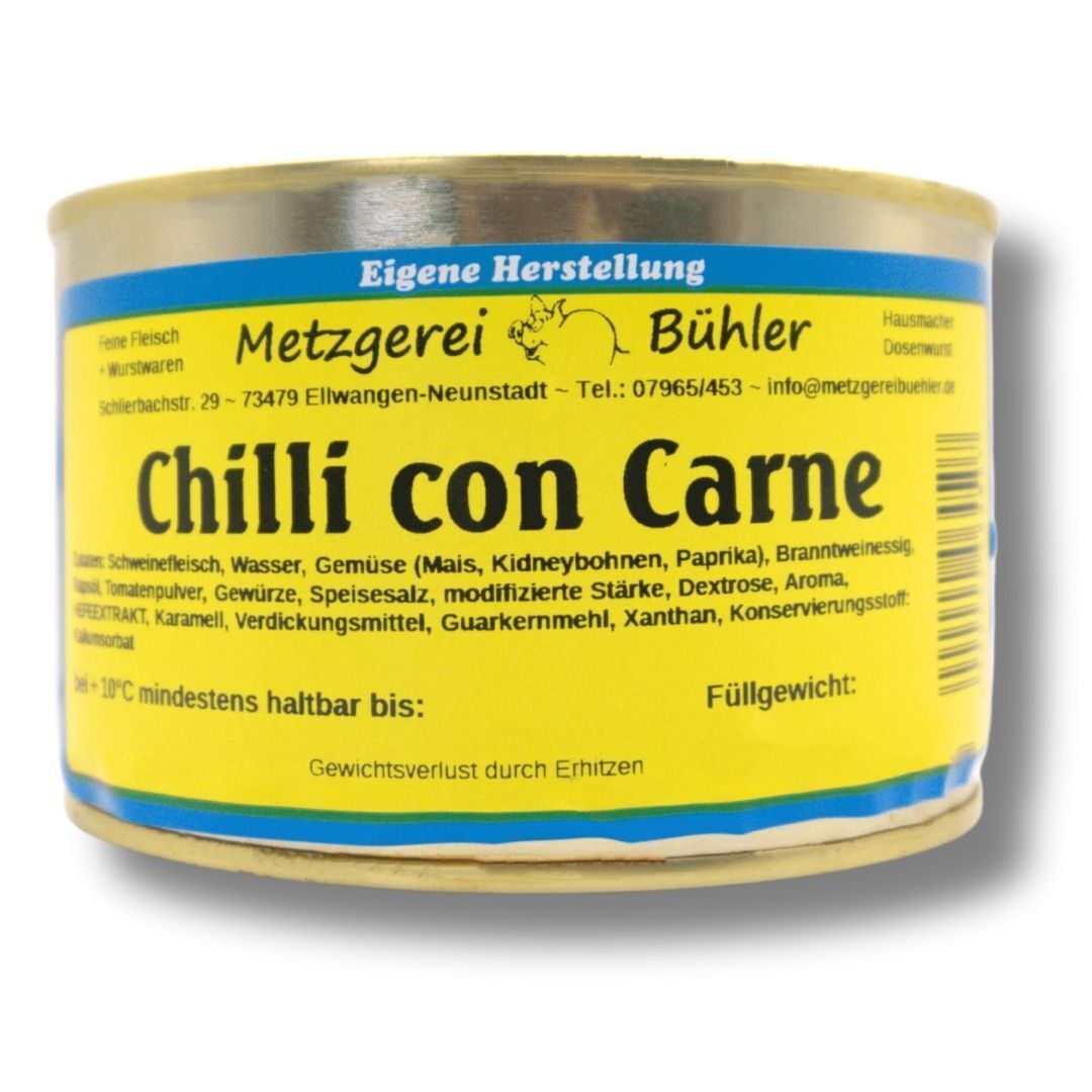 Entdecken Sie die pikante Welt der Tex-Mex-Küche mit unserem Chilli Con Carne Fertiggericht aus der Metzgerei Bühler, erhältlich in den praktischen 400g und 800g Fleischkonserven. Hergestellt aus hochwertigem Schweinefleisch, ist dieses Fertiggericht ein herzhafter Genuss für alle Liebhaber von Fleisch und pikanten Speisen.
