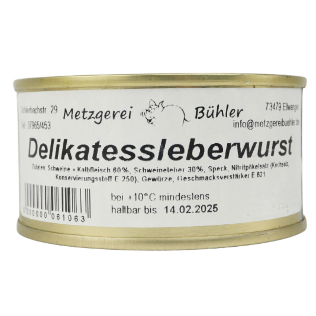 Lassen Sie sich von unserer Delikatess Leberwurst verführen, eine raffinierte Mischung aus Schweine- und Kalbfleisch. Unsere Leberwurst besticht durch ihren reichen, herzhaften Geschmack und die hohe Qualität des Fleisches, das aus nachhaltiger Landwirtschaft stammt.