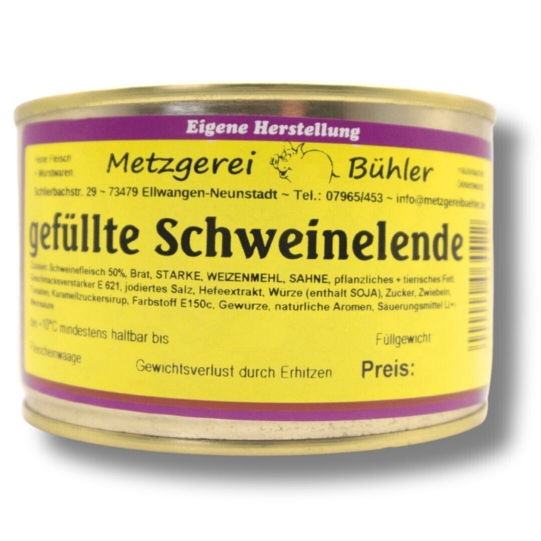 Erfahren Sie kulinarische Exzellenz mit unserer gefüllten Schweinelende aus der Metzgerei Bühler, liebevoll verpackt in den praktischen 400g und 800g Fleischkonserven. Dieses Fertiggericht ist eine wahre Delikatesse, die die Qualität und den Geschmack unseres handwerklich hergestellten Schweinefleisches hervorhebt.